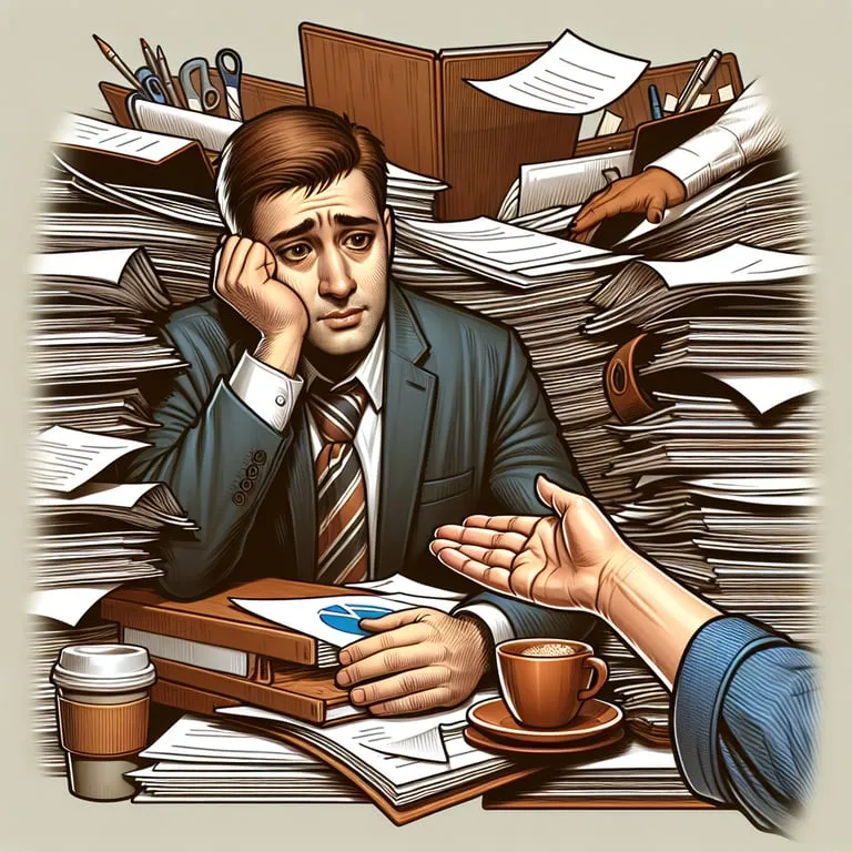 > 한 젊은 창업가가 책상에 앉아 서류 더미를 보며 막막한 표정을 짓고 있습니다. 그의 옆에서 따뜻한 느낌의 손이 나타나 격려하듯 어깨를 가볍게 두드리며 김이 모락모락 나는 커피 한 잔을 건네는 장면을 그려주세요. 전체적으로 희망적이고 따뜻한 분위기를 연출하고, 창업가의 얼굴에는 안도감과 희미한 미소가 번지는 모습으로 표현해주세요.